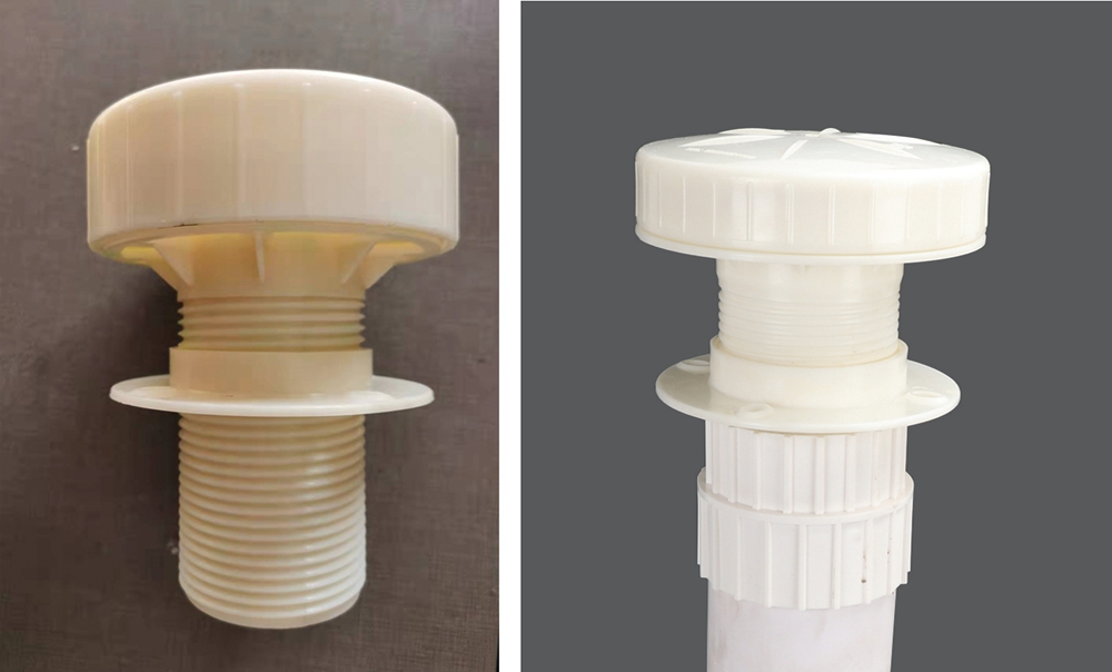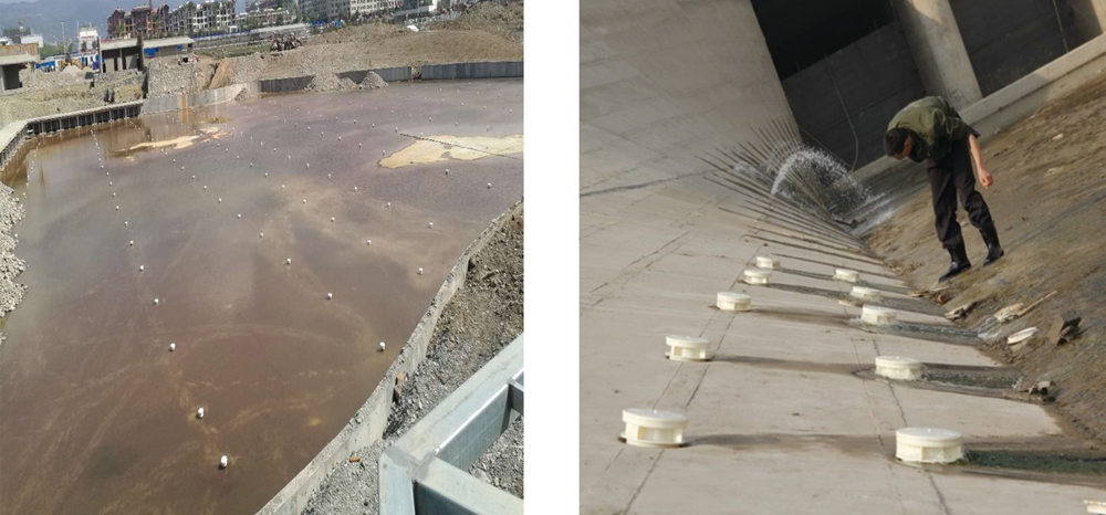 當(dāng)防滲膜上下的水頭差達(dá)到2cm~10cm時(shí),逆止閥的蓋板受到水壓后在然力作用下開啟,起到單向排水孔的功能,受制動(dòng)頂蓋及彈簧的作用,壓力水改變了原水流的方向,揚(yáng)壓力水向外、向下排出,降低滲透水壓力。當(dāng)防滲膜內(nèi)外水平衡時(shí),蓋板關(guān)閉防止渠水回流,實(shí)現(xiàn)了單向通水。又因,壓力水向下排出,沖洗排水口,解決微生物、泥沙堵塞出水口的問題。